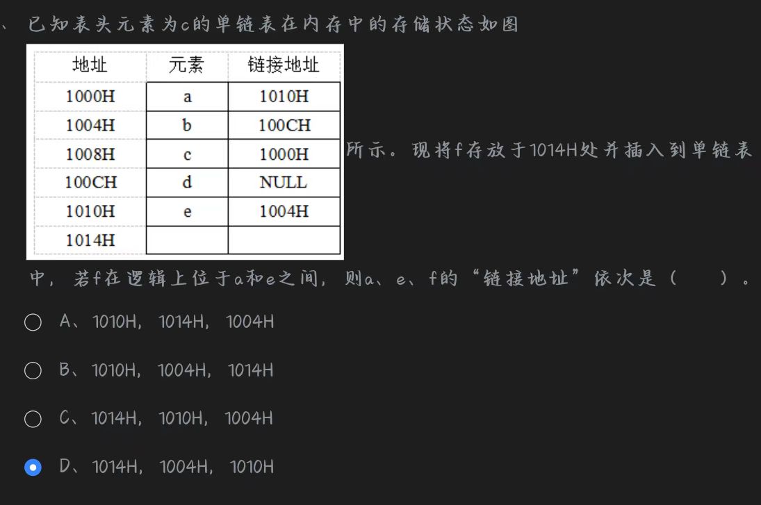 解答:已知这是一个单链表,f在a和e之间,c是表头,b元素指向100CH,而d的链接地址为空,所以d是最后一个。顺序为c-a-e-b-d.